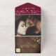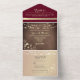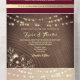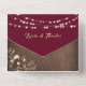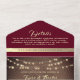 Cette faire-part de mariage tout-en-un rustique présente un arrière - plan chaleureux aux grains de bois, des tonalités bordeaux, des lampes à cordes brillantes et de délicats accents floraux, parfaits pour les mariages de grange, de forêt ou de campagne. Avec le RSVP intégré, un emplacement pour votre site Web mariage, et une photo personnalisée et une adresse de retour sur le dos, ce design écologique offre à la fois style et fonctionnalité. Remarque : Une enveloppe séparée est nécessaire pour l'envoi par la poste.