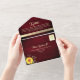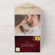 Célébrez le charme intemporel de l'amour avec ce faire-part de mariage tout-en-un enchanteur, alliant chaleur rustique et élégance moderne. Conçu sur du papier bordeaux d'inspiration barne, il présente une dentelle dorée chatoyante et la douce lueur des lampes à cordes, créant une atmosphère cosy et sophistiquée. Des tournesols radiants apportent une touche symbolique joyeuse, tandis qu'une photo personnalisée du couple sur le dos le rend profondément personnel et mémorable. Les détails de votre mariage et l'information RSVP sont magnifiquement intégrés dans une mise en page simple et pratique, idéale pour les mariages d'automne ou de style rustique. Remarque : Cette invitation tout-en-un nécessite une enveloppe distincte pour l'envoi. Nous vous recommandons de l'apparier avec une enveloppe A9 standard (5,75 po x 8,75 po) pour un meilleur ajustement.
