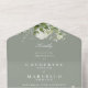 Faire-part de mariage tout-en-un avec une belle végétation fleurie, une typographie élégante et des initiales monogrammes sur un arrière - plan vert sage. L'invitation comprend une carte RSVP perforée avec votre code QR du site Web mariage. Conçu par Thisisnotme©