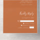 Cette simple faire-part de mariage tout-en-un moderne présente du texte blanc sur un arrière - plan orange brûlé. Ajoutez les noms de la mariée et du marié en calligraphie stylisée et les détails en police sans serif. Ajoutez votre adresse de retour en blanc sur le rabat extérieur orange brûlé et sur le dos du RSVP amovible.