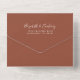 Cette simple faire-part de mariage tout-en-un moderne présente du texte blanc sur un arrière - plan orange brûlé en terre cuite profonde. Ajoutez les noms de la mariée et du marié en calligraphie stylisée et les détails en police sans serif. Ajoutez votre adresse de retour en blanc sur le rabat extérieur et sur le dos du RSVP amovible.