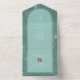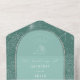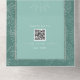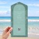 Illustration d'art en ligne blanche de palmier feuille motif sur aqua arrière - plan avec texte blanc et design de coquillages sur aqua arche avec bordure bronzée. A l'extérieur est rose avec l'adresse de retour et l'illustration en feuille de palme sur le rabat. Rsvp utilise du code qr.