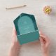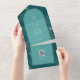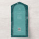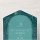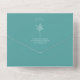 Illustration d'art en ligne blanche de palmier feuille motif sur aqua arrière - plan avec texte blanc et conception de coquillages sur arche turquoise avec bordure grise. L'extérieur est turquoise avec l'adresse de retour et l'illustration en feuille de palme sur le rabat. Rsvp utilise du code qr.