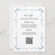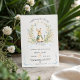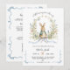 Invitation de baby shower aquarelle adorable tout-en-un représentant un petit lapin attachant dans un charmant manteau, niché dans une délicate couronne florale avec des fleurs douces bleues et roses. "Un petit lapin est en route" - parfait pour accueillir votre petit garçon ou pour une célébration neutre ! Comprend un espace pour vos détails personnalisés : date, heure, lieu et un code QR pratique pour un accès facile au registre. Idéal pour un thème fantaisiste inspiré de Pierre Lapin ou pour une baby shower de printemps/été. Personnalisez facilement et commandez dès aujourd'hui pour une invitation mémorable qui ravit vos invités !