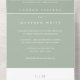 Un modèle tout-en-un unique avec carte rsvp pour une option pratique et économique pour les couples économes en budget. L'invitation moderne mais élégante comprend votre monogramme à deux lettres en haut ainsi que vos détails mariages en blanc sur un arrière - plan vert sage. Un design chic et design qui conviendra à un couple minimaliste.