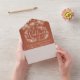 Le tout dans un faire-part de mariage avec de jolies lampes à cordes, des guirlandes florales dessinées à la main et une typographie chic sur un arrière - plan en terre cuite. L'invitation comprend un RSVP perforé avec votre code QR du site Web mariage et des détails. Conçu par Thisisnotme©