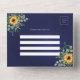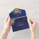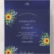 Un arrière - plan bleu marine décoré de tournesols aquarellés, de verdure d'eucalyptus. La couleur bleue est inégale. Personnalisez et ajoutez vos noms, monogrammes et détails mariages.