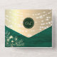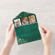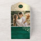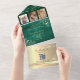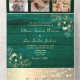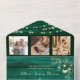 Célébrez votre amour avec notre élégante faire-part de mariage tout en un d'inspiration campagnarde. Doté d'une combinaison époustouflante d'or et de bois rustique aux accents vert émeraude, ce design est orné de lampes à cordes et de dentelle fleurie boho vintage. Personnalisez-le avec quatre photos personnalisées du couple, et incluez votre site web et code QR pour RSVP et des détails supplémentaires.