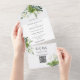Cette faire-part de mariage tout en un présente une végétation botanique qui traverse une typographie élégante. L'invitation comprend une carte RSVP perforée avec un code QR. Conçu par Thisisnotme©