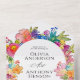 Le design de la faire-part de mariage est élégant et dynamique, avec une bordure florale d'aquarelle joyeuse qui ajoute chaleur et charme tout en encadrant le texte magnifiquement. La typographie combine une police serif sophistiquée pour les noms avec un script délicat pour "And", créant un intérêt visuel. L'alignement central du texte assure un aspect propre et formel, ce qui facilite la lecture des détails. Les tons pastel et floral clair complètent le thème romantique, ajoutant une touche festive et vivante.