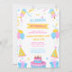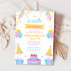 le design montre une invitation d'anniversaire pour les enfants en jaune, bleu ciel et rose au milieu et beaucoup de ballons, casquettes d'anniversaire, cadeaux d'anniversaire etc autour. ce design est extrêmement coloré et mignon et sera idéal pour tous les enfants.