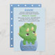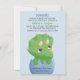 Rawr ! Célébrez avec maman d'être avant que son petit un éclose. Cette invitation a un mignon petit triceratops de bébé vert avec des cornes jaunes et des pointes en regardant dehors de la coquille d'oeuf! Illustration créée numériquement avec des pinceaux aquarelle. Personnalisez facilement les détails de la partie dans le modèle texte fourni. Au verso, il y a des pois blancs sur un arrière - plan bleu.