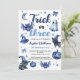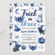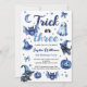 Bleu Halloween 3ème anniversaire invitation pour les enfants avec le texte "tour ou trois" et des illustrations aquarelle avec chauves-souris, chats, sorcières casquettes, citrouilles, fantômes, et étoiles. Personnalisez le texte avec les détails du parti et les informations RSVP.