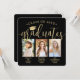 C'est une triple fête de graduation ! Annoncez la réussite de trois diplômés et de la famille et des amis invitations à célébrer avec des invitations costumées à la fête de remise de diplômes carrés photo. Toutes les images et le libellé sont simples à personnaliser, et les couleurs peuvent être customisées à l'aide de l'outil de design Zazzle. (CONSEIL EN MATIÈRE DE PLACEMENT D'IMAGE : Une façon simple de positionner une photo exactement comment vous voulez est de la rogner avant de la télécharger sur le site Zazzle.) Ce modèle est une carte de faire-part combinée sur le devant avec l'invitation de la grande fête sur le dos. Le design moderne en noir et or présente une calligraphie manuscrite avec un casquette en carton de mortier, une typographie classique élégante et 3 photos de votre choix, telles que des images de haut niveau ou des images de la cérémonie de début. Veuillez noter que l'or est imprimé en couleur et non en métal. Cette carte d'invitation à la remise des diplômes est une façon élégante d'annoncer une fête spéciale pour n'importe quel élève de trois niveaux, comme les frères et soeurs, les meilleurs amis, les cousins, les triplets, les coéquipiers, les frères et soeurs, etc. Félicitations aux diplômés !