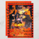 Sorcières Invitation de la fête d'Halloween avec 3 vieilles sorcières caricaturales en brassant en noir sur un caldron sur un feu de bois avec de la fumée et des flammes. Feuilles d'automne sur le sol et scène est par un arbre avec grand tronc. Couleurs noires, orange et jaunes. Une souris se déplace le long du bas du dessin. Une vieille sorcière grasse se tenant près du feu et 2 autres sorcières sont maigres. Un grand oiseau noir perché sur une branche au-dessus regarde la scène. Texte Happy Halloween et en bas "Venez rejoindre la fête des sorcières." Aux alentours se trouve une bordure de chats sur un citrouille sculpté d'Halloween. Bordure d'invitation est un motif de chats noirs sur citrouilles sculptés Halloween. Retour de l'invitation sont des espaces à remplir vos informations et Costume. Une vieille sorcière maigre en noir et casquette noir pointu et large bord grins à vous. Toutes les oeuvres réalisées par Patricia Villa avec des stylos à marqueurs d'artistes.