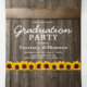 Une fête de remise de diplômes de pays 2 en 1 rustique triple invitation avec un arrière - plan de tonneau en bois rustique, des lumières à cordes scintillantes, des tournesols jaune vif, des photos du diplômé, l'année de cours, les détails de la célébration de remise de diplômes, et une carte postale rsvp pour vos invités à couper et renvoyer.