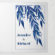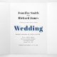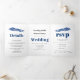 Branche Eucalyptus en faire-part de mariage triplé bleu. Un design agréable pour votre mariage d'hiver. La couverture présente des branches en cascade de feuilles eucalyptus et les noms du couple. Les panneaux intérieurs comprennent les détails de votre mariage et de votre RSVP qui peuvent être détachés. Il y a une photo du couple à l'extérieur derrière.