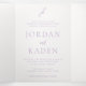 Elégante invitation de mariage triplé avec un design classique avec votre monogramme dans une police de script avec vos noms et détails dans une police de serif traditionnelle.
