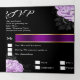 Un superbe design tout-en-un luxueux et glamour avec une jolie robe en pierre de rhinocéros violette dressée contre un arrière - plan noir infusé de délicates fleurs roses florales pourpres et bords d'angle argentés. Le tiers inférieur a une carte de réponse déchirante avec adresse rsvp personnalisée et options de repas à compléter pour vos invités. Elles sont idéales pour une quinceanera; douche nuptiale; tout anniversaire d'âge ou un événement spécial pour célébrer la femme. Personnalisez le libellé, la couleur arrière - plan et ajoutez votre propre photo pour le rendre unique.
