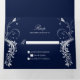 Des invitations de mariage triplées élégantes vous offrent tout ce dont vous avez besoin en un seul endroit - arrière - plan bleu marine avec tourbillons floraux blancs ornés. Personnalisez avec vos propres informations. Si vous avez besoin d'aide pour cette invitation ou pour des demandes personnalisées avec lesquelles vous avez besoin de mon aide, ne placez pas cette marchandise dans votre panier. Au lieu de cela, envoyez-moi votre demande par courriel à shutterbug600@yahoo.com. Remarque : Je ne peux que vous aider dans la conception - toute l'expédition et l'impression sont traitées par Zazzle et les questions concernant votre commande doivent être adressées à Zazzle support : SUPPORT : https://help.zazzle.com/hc/en-us/articles/221463567-How-Do-I-Contact-Zazzle-Customer-Support-. Je n'ai pas accès à votre compte et je ne peux pas apporter de modifications une fois que vous avez passé votre commande. De plus, le CONVERSATION n'est pas en vie, mais je réponds généralement dans les 24 heures.