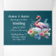 Ce joli faire-part de mariage triplé est livré en un seul morceau avec toutes les informations sur une page. Il suffit de couper la carte de réponse et de renvoyer le courrier à la mariée. Texte blanc et éléments sur un arrière - plan gris bleu avec des Flamants roses roses sur chaque partie de l'information et un Flamant rose sur la partie de l'adresse.