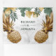 Éblouissez vos invités avec cette élégante invitation de mariage à thème tropical tout-en-un avec de beaux feuilles aux faux ananas en feuille d'or sur un arrière - plan en marbre blanc avec carte postale RSVP détachable. Ajoutez simplement les détails de votre événement sur ce modèle facile à utiliser et ornez cette carte avec votre photo préférée pour en faire une invitation unique.