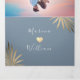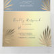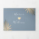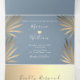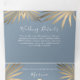 Simple, moderne, tropical, invitation de mariage de plage en été bleu poussiéreux 3 en 1 pliable, avec feuilles de palmier dorées et photo du couple.