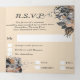 Un superbe design tout-en-un luxueux et glamour avec des papillons en nacre flottant à travers un arrière - plan pastel pêche orange qui a des roses noirs au charbon de bois bordés de faux sprigs en argent cachés dans les angles. Le milieu a une incrustation photo couleur pour la photo du couple nuptial et il est flanqué sur la gauche avec les détails pour la cérémonie de mariage et sur la droite, une bande R.S.V.P coupée pour vos invités à compléter et revenir. Ce design floral sur mesure est idéal pour les mariages d'été et de printemps ou d'extérieur en bois.