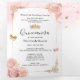 Créez vos propres invitations triplées quinceanera uniques et élégantes sur un simple modèle rose clair et or do-it-yourself qui est facilement personnalisé avec des photos glamour Mis Quince Anos. Le design floral broussailleux illustré par Raphaela Wilson présente une texture de papier parchemin d'aquarelle blanche, des roses rose clair et des accents d'or faux métallique sur les roses, la tiare de princesse couronne, robes/fraise en figuier et confettis de papillon parties scintillant étincelant. Le texte en anglais est facile à traduire en espagnol avec la mise en page traditionnelle des invitations mexicaines. Il y a beaucoup de place sur les 6 panneaux de cartes pliées, qui vous permettra de mettre tous vos détails importants (par exemple rsvp/info programme, 3 photos, texte de remerciement (pour madrinas, padrinos, chambelanes, cour d'honneur etc.)... Ces élégantes invitations en forme de triple pli avec des fleurs vous donnent la flexibilité de conception pour choisir différentes couleurs arrière - plans et même changer la typographie du script de calligraphie et des polices modernes à un autre style de votre choix. Qu'il s'agisse d'une quinceanera rose et or rousse que vous fêtiez, d'une douce fête de 16 ans pour votre fille, d'une mariage de princesse Cendrillon, d'une douche nuptiale rousse, ou même d'un baby shower princesse de conte de fées, ces invitations quinceanera rose pâle conviennent à ceux qui ont une fois des occasions spéciales. Catégorie : invitations quinceanera d'aquarelle rose avec photos; thème élégant papillon quinceanera; et invitations d'anniversaire quinceañera d'or roux avec photos. Couleurs de soirée à thème or et blush : rose clair, blush, rose pastel, doré jaune champagne, noir et blanc.