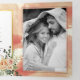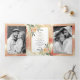 Fleurs d'aquarelle de pêche de corail et terre cuite à fleurs feuilles triple Invitation mariage de automne. Ce design élégant présente un cadre doré et des fleurs d'aquarelle de pêche corallienne avec de succulents feuilles sur des éclaboussures d'aquarelle en terre cuite douce sur les coins supérieur gauche et inférieur droit et votre texte en or et noir sur le couvercle. Le premier et le dernier panneaux intérieurs ainsi que le volet extérieur comprennent des photos du couple tandis que le panneau central intérieur affiche les détails du mariage. Le dos extérieur présente des détails sur RSVP et plus encore.