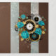 Patterned, antique watch, adorned with jewelry, gold hour hands and Latin numerals with turquoise roses on brown, striped background. Steampunk style.
