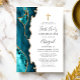 Le bord gauche de cette élégante invitation à la première communion moderne comporte une bordure d'aquarelle bleue turquoise ornée d'une parties scintillant en faux or. Une fausse croix de feuille d'or apparaît au-dessus du texte personnalisable, qui combine l'écriture manuscrite, les polices cuivre et italique en gris fusain sur un arrière - plan blanc. L'envers présente un design d'agate turquoise et or assorti.