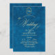 Elégante faire-part de mariage moderne turquoise et or avec une police manuscrite élégante avec des boucles et un monogramme de la mariée et du marié. Invitation classique et élégante, simple et moderne.