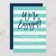 Élégante invitation de la partie d'engagement avec les mots "We're Engaged" dans un script de brosse bleu tendance contre un arrière - plan à rayures turquoise et blanche. La carte a un côté arrière bleu correspondant. Consultez d'autres éléments correspondants ici https://www.zazzle.com/collections/119250194970828530?rf=238364477188679314 Personnalisez-le en remplaçant le texte de l'espace réservé. Pour plus d'options comme changer la police et sa taille/couleur ou l'espacement entre les lettres cliquez sur le bouton "Personnaliser". *Veuillez noter que le filigrane Zazzle qui apparaît dans l'aperçu du zoom n'apparaîtra PAS sur le produit imprimé final. © Bois de rose et agrumes