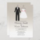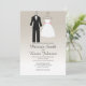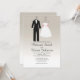 Une faire-part de mariage simple et tendance avec un arrière - plan dégradé neutre, avec un smoking et une robe mariage.