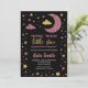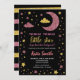 Cette petite étoile scintillante mignonne et élégante" invitation baby shower présente arrière - plan noir avec faux or et rose étoiles de parties scintillant, lune et nuages. Le design inverse est une alternance de bandes de parties scintillant dorées et roses. Modifiez la couleur arrière - plan de votre choix. Plus de produits correspondants dans cette collection.