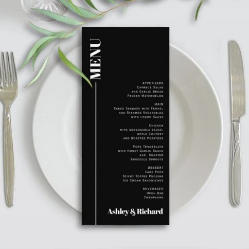 Cette faire-part de mariage est un exemple frappant de design moderne et minimaliste. Les tons noirs dégagent beaucoup de raffinement, tandis que la typographie blanche chic apporte une touche d'élégance. L'aménagement spacieux renforce l'esthétique générale, créant un aspect propre et élégant. Une ligne verticale blanche sur le côté gauche de l'invitation ajoute une intrigue visuelle contre l'arrière - plan noir. Les noms du couple sont intelligemment incorporés, s'étendant vers le haut, donnant une touche personnalisée au design. Avec un texte minimal, l'invitation se concentre sur le mot blanc et gras "MARIAGE" et les détails essentiels, assurant une lisibilité et une compréhension aisées. Pour rendre RSVP sans tracas, le verso de l'invitation comporte un code QR pour la réponse en ligne.