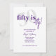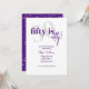 La typographie en gras avec calligraphie 50 est des invitations de fête d'anniversaire astucieuses en violet et blanc. Le dos présente un fond tout violet avec des taches/bulles blanches pour imiter les bulles dans le vin et le champagne pour célébrer comment nous vieillissons comme un bon vin. Tout le texte est entièrement personnalisable.