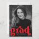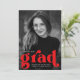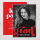 Cartes d'invitation de fête de remise de diplômes en gras avec la photo verticale du diplômé et "grad" en lettres rouges en gras. Personnalisez les invitations de fête de photo de remise de diplômes en ajoutant le nom du diplômé, l'année de remise de diplômes et l'école. Le verso des invitations de fête de remise de diplômes rouges affiche les détails de votre fête.
