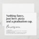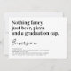 🎉🎂 Invitez amis et famille à célébrer un diplôme avec cette invitation de fête à la typographie amusante. Le texte indique "Rien de fantaisiste, juste de la bière, de la pizza et une casquette de diplômé."