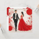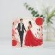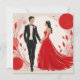 C'est une illustration stylisée et romantique d'un couple, représentant probablement une mariée et un marié ou une occasion formelle comme un bal ou un gala. L'homme est vêtu d'un smoking noir élégant avec une chemise blanche et un nœud papillon noir, agrémenté d'une boutonnière blanche. Il a les cheveux foncés et un profil ciselé. La femme porte une robe de bal rouge, strapless, saisissante, avec une jupe fluide. Ses longs cheveux foncés sont ondulés, et elle porte un diadème délicat et scintillant. Ils se tiennent par la main et se regardent, créant un sentiment de connexion et d'intimité. L'arrière-plan est d'un blanc cassé doux, orné d'éléments abstraits et botaniques dans des nuances de rouge et de rose. Ceux-ci comprennent de grands cercles rouges, des points plus petits et des branches stylisées avec des feuilles, qui encadrent le couple et ajoutent à l'atmosphère artistique et festive de l'image. Le style général est moderne, élégant et graphique.