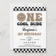 Fêtez le grand jalon de votre petit avec cette super invitation de 1er anniversaire ! Doté d'un visage bronzé et d'un arrière - plan blanc propre, ce design équilibre parfaitement une ambiance moderne avec une touche rétro. La bordure en à damiers noir et blanc donne une touche ludique mais élégante, donnant une touche cool et les années 70.