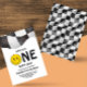 Préparez-vous à fêter un jalon avec ce Modèle éditable numérique One Happy Dude First Birthday Invitation. Ce design cool présente l'emblématique phrase "ONE HAPPY DUDE", un visage souriant super avec des boulons éclair, et un motif de damier classique, le tout dans une palette de couleurs noir, blanc et jaune élégante. C'est le choix idéal pour une fête de premier anniversaire rétro ou moderne pour un bébé.
