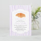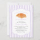 Célébrez votre petite fille sucrée avec cette invitation baby shower "A Little Croissant Is On Her Way" dans une douce lavande violette colorée. Ce design est composé d'un croissant d'aquarelle peint à la main, d'un script élégant et de rayures violettes pastel, pour un style cosy et d'inspiration parisienne. Un choix qui plaira à une boulangerie, un brunch ou un baby shower à thème français. Personnalisez avec vos détails d'événement pour une célébration élégante et mémorable.