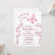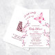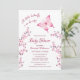 Carte de remerciements téléchargeable disponible. Une version sans code qr est disponible. Un petit papillon est en route | Un papillon rose chaud et des cerisiers fleurissent sur un arrière - plan blanc. Jolie invitation de baby shower fille avec des textes personnalisés dans une police élégante. A l'arrière se trouve un code QR pour le registre des cadeaux d'honneur.