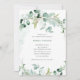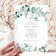 Cette invitation branchée à la douche nuptiale présente une élégante verdure d'eucalyptus aquarelle, avec beaucoup de feuillage, feuilles verts et branches. Elles décorent un simple arrière - plan blanc avec du texte moderne classique et des éclaboussures subtiles d'aquarelle.