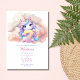 Une licorne adorable et mignonne portant le numéro 7 pour cette invitation de fête de septième anniversaire. Les couleurs sont le bleu rose et le violet. Tous les champs sont modifiables.