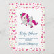 Baby shower invitation avec une licorne ailée blanche avec crinière rose, queue et sabots. La corne a des anneaux de couleur arc-en-ciel et ressemble à une sucrerie. Cette mignonne licorne s'élève sur ses pattes arrières. Coeur rose doux sur la joue. arrière - plan est un motif de coeurs rose et vert. Tous les détails de la fête sont à l'arrière.