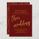 La distinction de cette suite simple et audacieuse est due à la police manuscrite moderne et décontractée utilisée pour les phrases d'accent et le motif vague libre placé sur l'arrière - plan. Les vagues évoquent les fêtards. Dans cette pièce, la police d'écriture manuscrite a été utilisée pour créer un graphique représentant les mots "leur mariage". Ce texte d'en-tête et ce motif arrière - plan ont tous deux été ornés d'un faux motif de feuille d'or. Utilisez les champs modèles pour ajouter vos détails personnels et faire de ce design festif votre propre. L'arrière - plan rouge bordeaux foncé peut être changé à n'importe quelle couleur. Veuillez communiquer avec toute demande spéciale ou customiser de l'aide. // 100 //