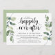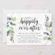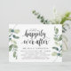 Carte d'invitation sur le thème de l'écriture noire moderne rustique avec végétation eucalyptus (avec titre de carte : pour aimer le rire et heureux pour toujours). Elle est parfaite pour votre réception de mariage en fuite / fête de célébration post-mariage. Ajoutez vos détails dans une police / lettrage noir assorti.